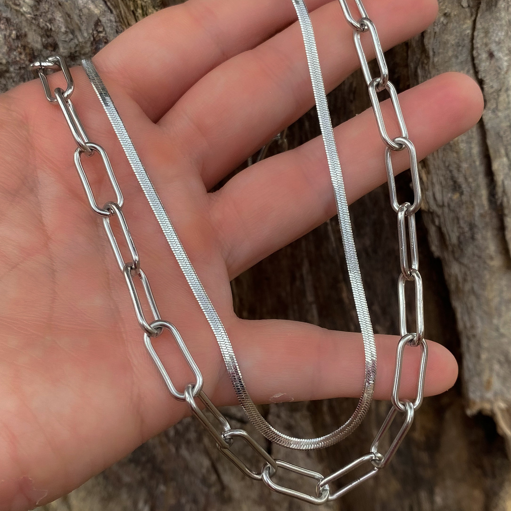 🌟 Colar Duplo Fita e Elos Grandes Aço Inoxidável 🌟 Adicione um toque de estilo ao seu visual com o nosso deslumbrante Colar Duplo Fita e Elos Grandes. Feito em Aço Inoxidável, este colar não apenas exala elegância, mas também garante durabilidade e resistência.